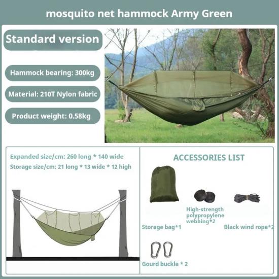 Hecho de tela de alta calidad, transpirable y duradera, acomoda cómodamente a dos personas, por lo que es ideal para acampar, caminar, mochileros o descansar en el patio trasero. La red integrada de mosquitos proporciona una protección efectiva contra los insectos, asegurando un descanso pacífico e ininterrumpido en la naturaleza.