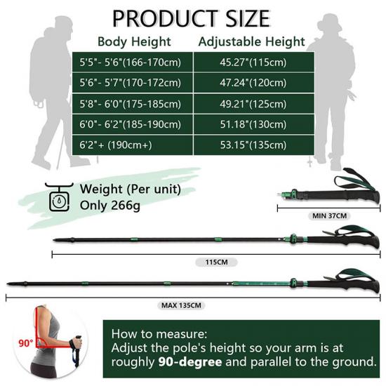 Al adoptar un sistema de bloqueo de combinación, este bastón de trekking se combina con un bloqueo rápido y un bloqueo por giro, y se construye un resorte antichoque en el área del bloqueo por giro, por lo que el daño impacta, usted puede moverse cada vez más rápido mientras usa energía.Con el Altura ajustable, los bastones para caminar se adaptarán a la mayoría de las personas. Además, el bastón de trekking con graduaciones claras y una punta de tope que puede extenderse de 25 "a 53". Es lo más pequeño y liviano posible. Adecuado para todas las alturas, desde corto hasta ¡Hombres altos, mujeres e incluso niños! Tenga cuidado de no excederlo.