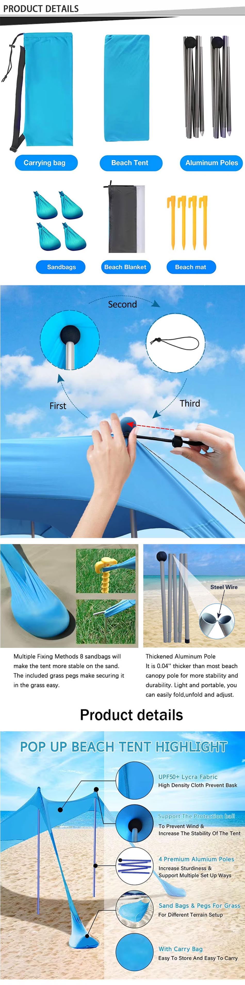 Producto : Este toldo de dosel de aluminio para acampar ofrece protección de Sunshade duradera, con un diseño de carpa de playa con anclajes de sacos de arena para estabilidad, perfecto para acampar al aire libre, picnics y viajes en playa.