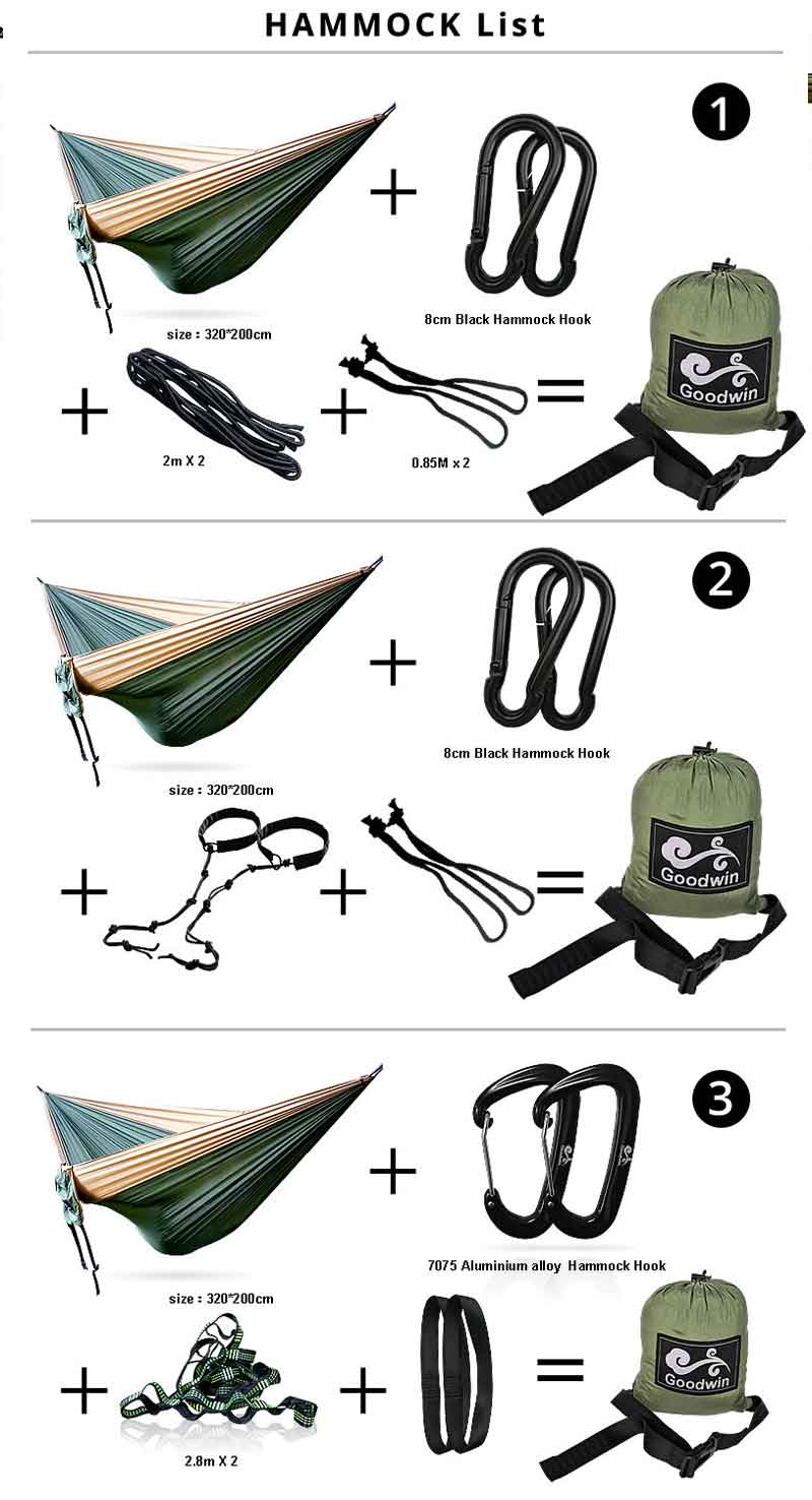 2)【material】nuestras hamacas de alta calidad hechas de 210t nylon , junto con mosquetones fuertes de 2 piezas y correas de hamaca amigables con los árboles de 2 piezas , que son fuertes , duraderas