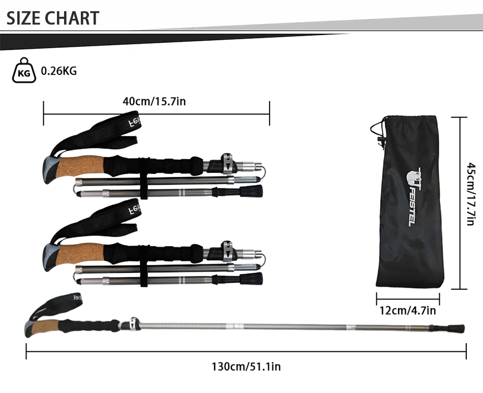 Feistel, venta al por mayor, aleación de aluminio, mango de corcho EVA, bastones de trekking plegables de bloqueo rápido