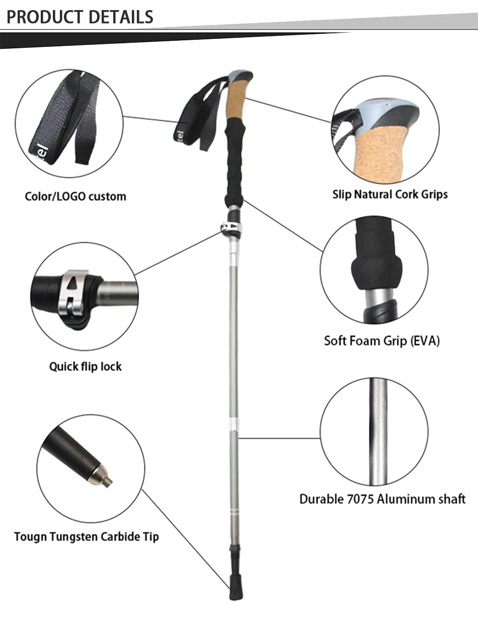 Producto : Los bastones de trekking de aluminio de aviación 7075 de 5 secciones personalizados cuentan con un mango de corcho, diseño plegable, correa segura y opciones OEM para un rendimiento de caminata y senderismo duradero, liviano y versátil.