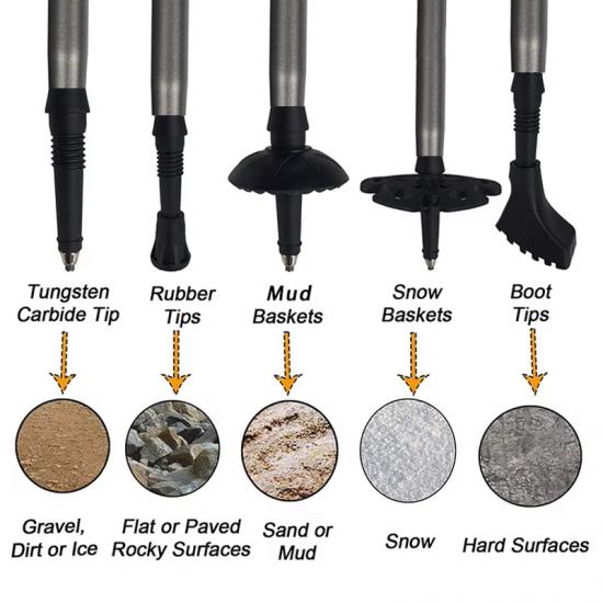 Los bastones de trekking de aluminio de aviación 7075 de 5 secciones personalizados ofrecen una solución para caminatas y senderismo plegable, duradera y ultraligera de primera calidad diseñada con un mango de corcho natural para mayor comodidad, control de la humedad y agarre, con un sistema de correa ajustable confiable para un soporte seguro de la muñeca, una estructura plegable compacta que se empaca sin esfuerzo para viajar y una construcción robusta de aluminio de grado aeronáutico que proporciona una resistencia excepcional en terrenos empinados, rocosos o irregulares, mientras que la opción OEM permite a las marcas adaptar los colores, logotipos, accesorios y empaques para las necesidades personalizadas del mercado, creando en última instancia un juego de bastones para exteriores versátil, ergonómico y de alto rendimiento ideal para excursionistas, excursionistas, mochileros y viajeros de aventura que buscan estabilidad confiable y rendimiento duradero en una amplia gama de entornos al aire libre.