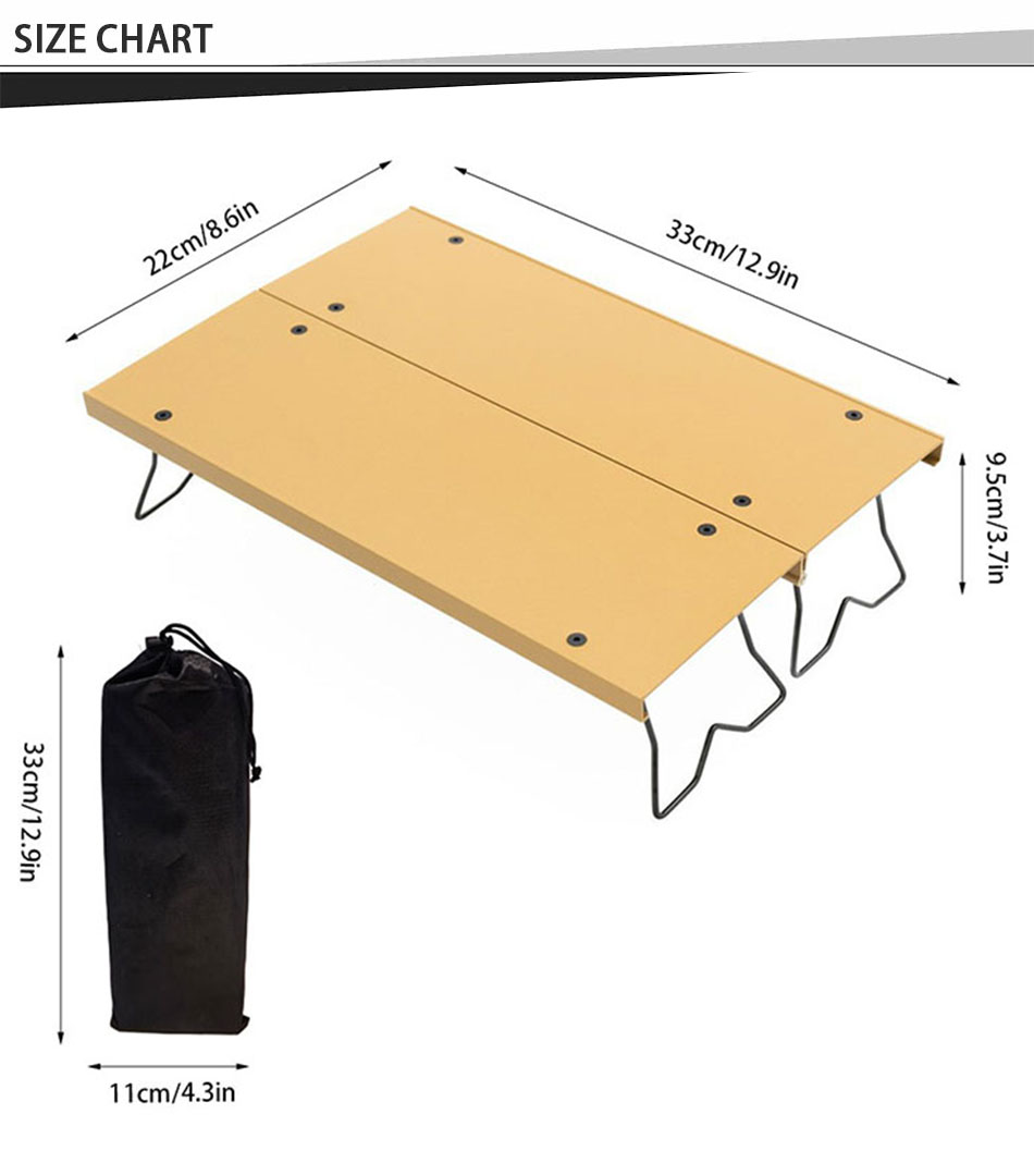 Hecho a partir de aleación de aluminio de alta calidad, esta mesa es excepcionalmente liviana pero resistente, proporcionando un apoyo confiable para varias actividades al aire libre, como acampar, picnics, senderismo, pesca y reuniones en el patio trasero. Su diseño plegable permite la configuración sin esfuerzo y el almacenamiento compacto, lo que facilita el transporte y el transporte en una mochila o un tronco de automóvil.