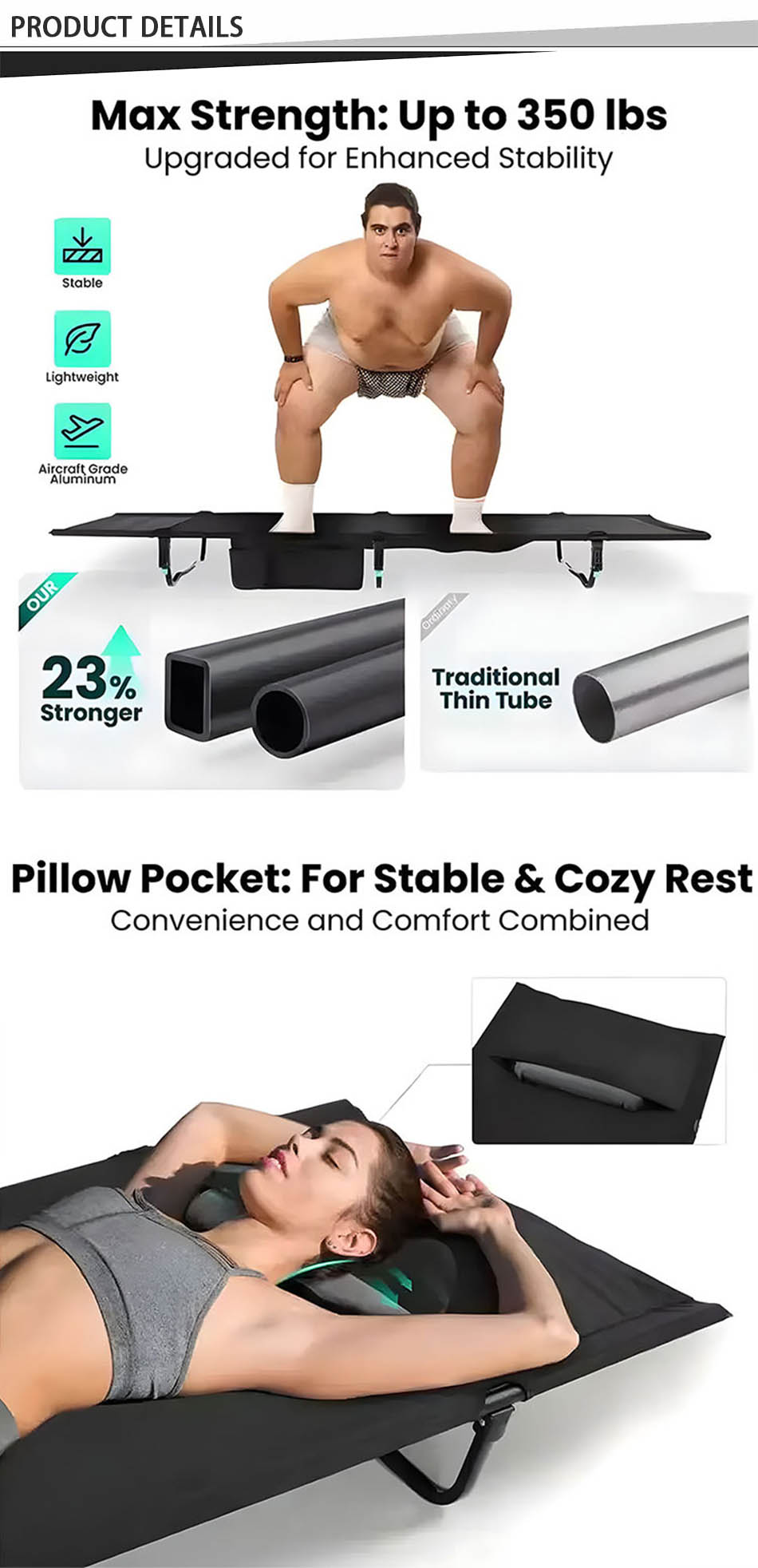 Cama de camping para dormir Oxford al aire libre de aluminio portátil con funda de almohada
