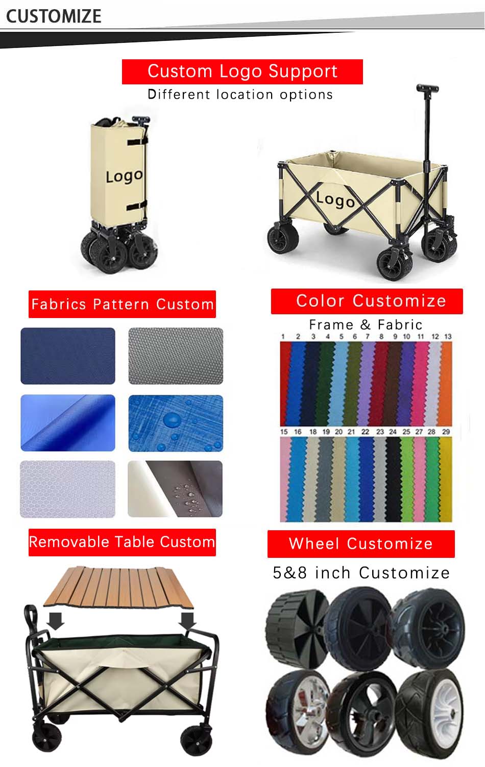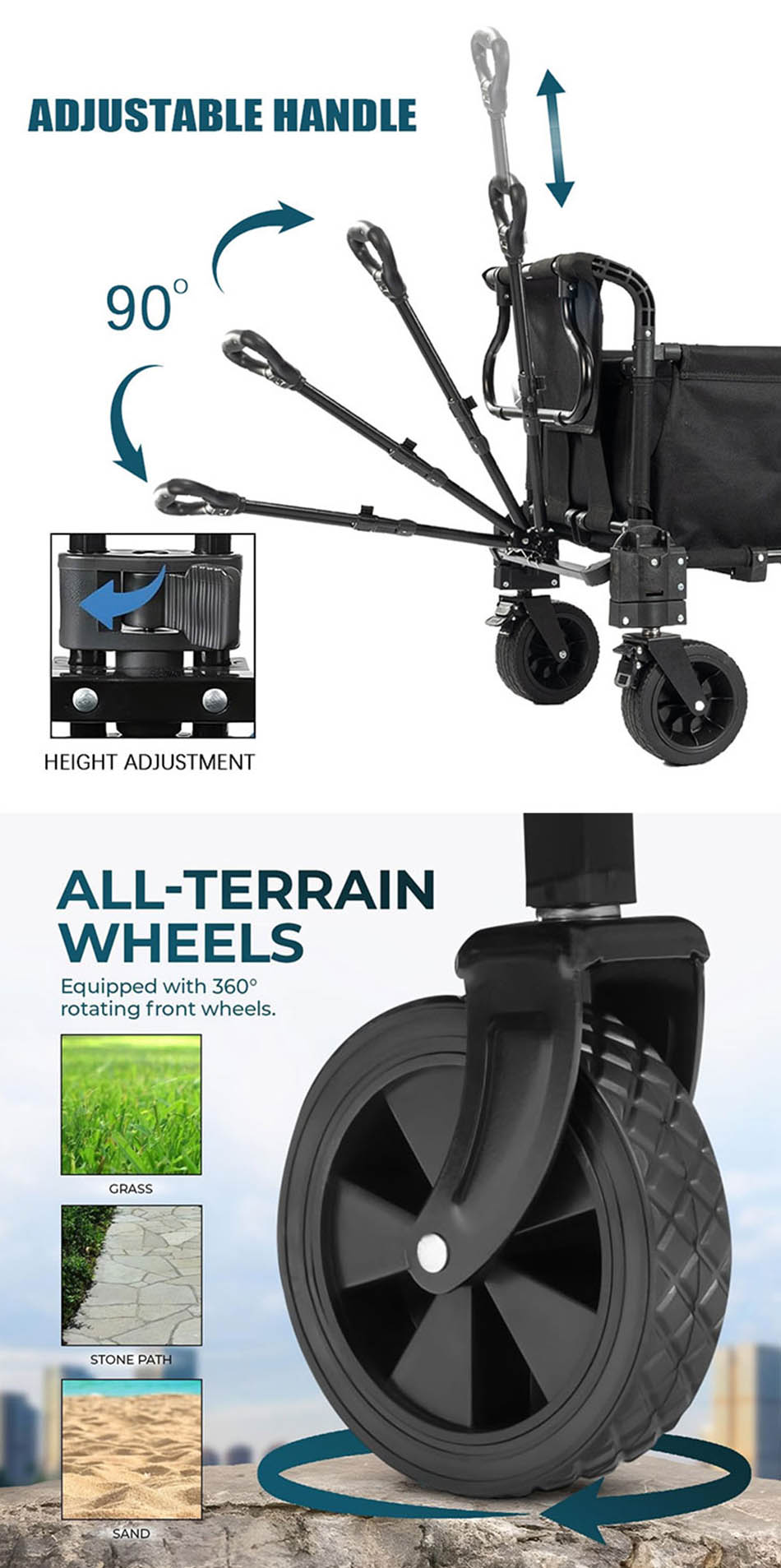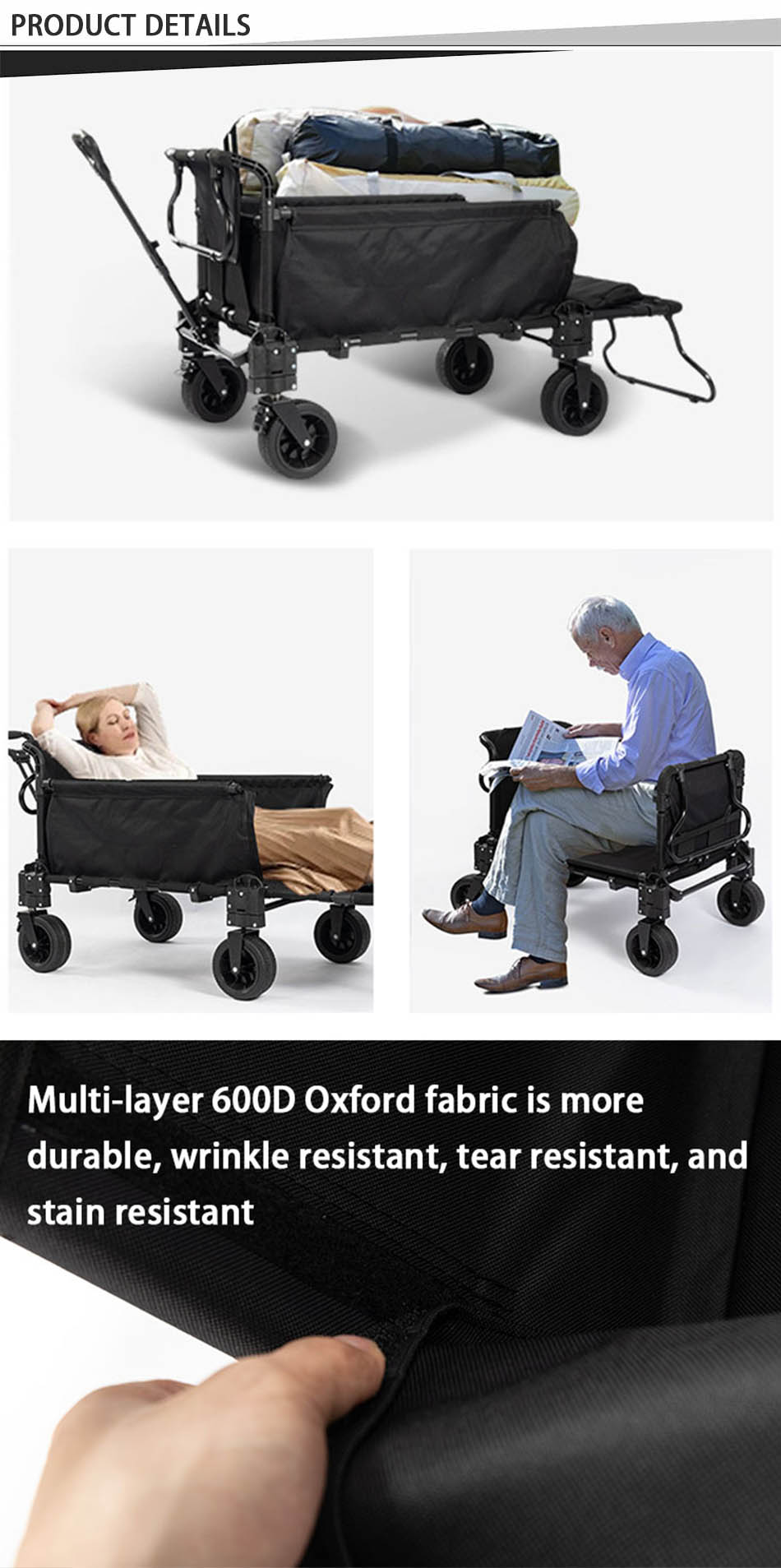 1.diseño plegable, ahorra espacio y es fácil de transportar; 2.fácil de instalar y abrir en un segundo; 3.gran capacidad, más almacenamiento; 4.las dos ruedas delanteras pueden girar 360°y con frenos dobles; 5.y adecuado para diferentes terrenos, caminos, hierba, caminos de grava, barro