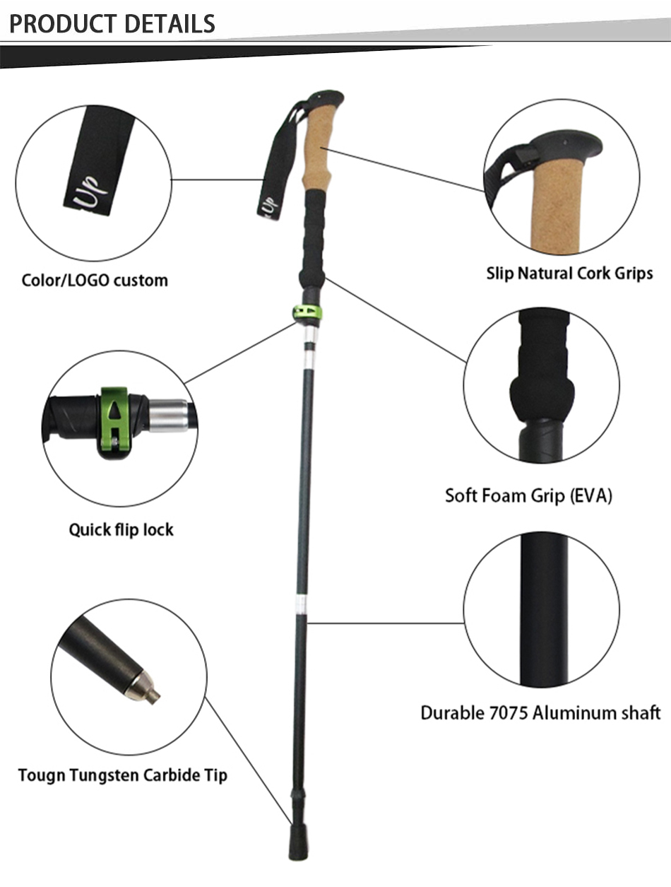 Feistel, venta al por mayor, aleación de aluminio, mango de corcho EVA, bastones de trekking plegables de bloqueo rápido