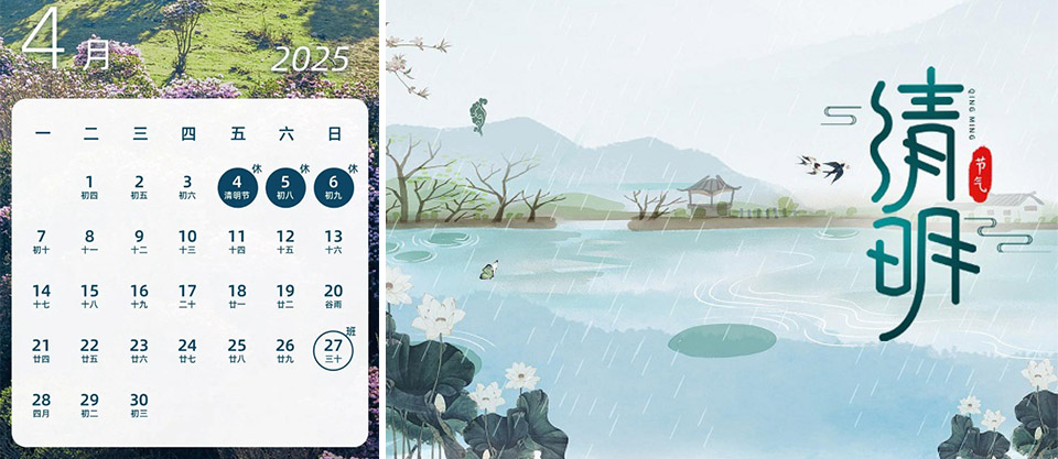 Se lanzó oficialmente el plan de vacaciones del Festival Qingming 2025: todos los empleados disfrutarán de tres días de vacaciones, del 4 al 6 de abril, y volverán al trabajo el 7 de abril. En esta temporada propicia para las salidas, la empresa lanzó simultáneamente el "Plan de Campamento de Primavera" para proteger el tiempo al aire libre de los empleados con equipo profesional.