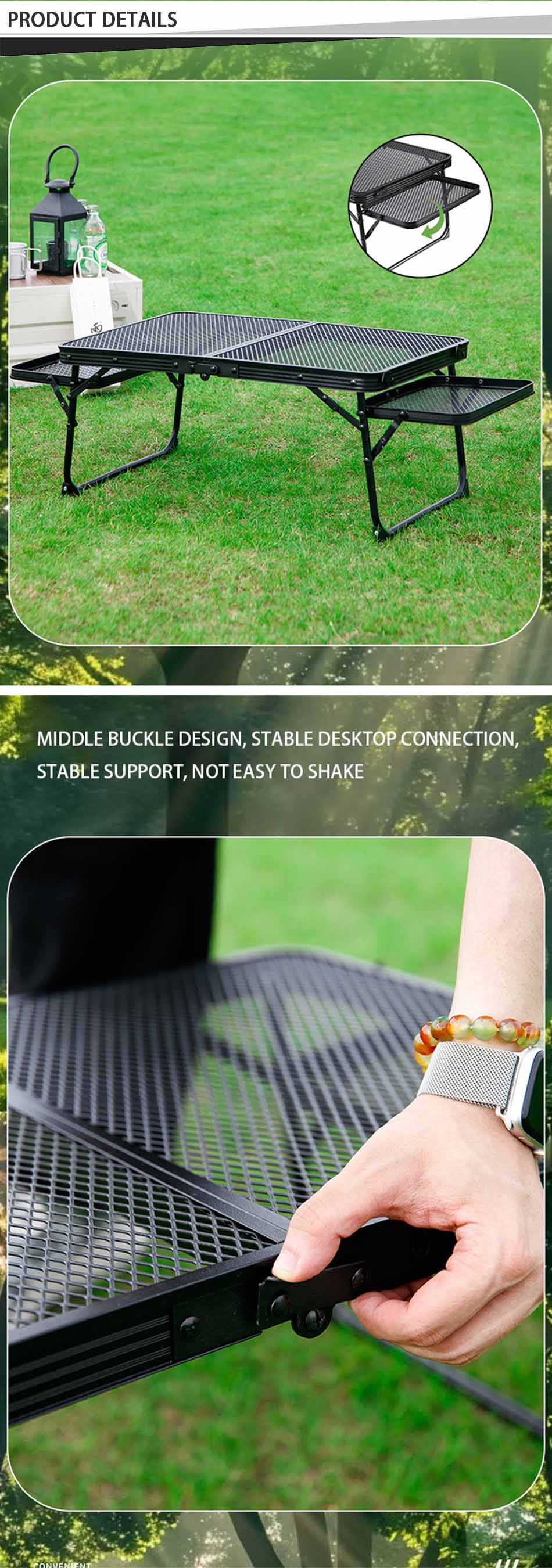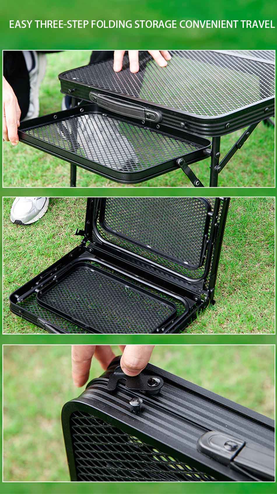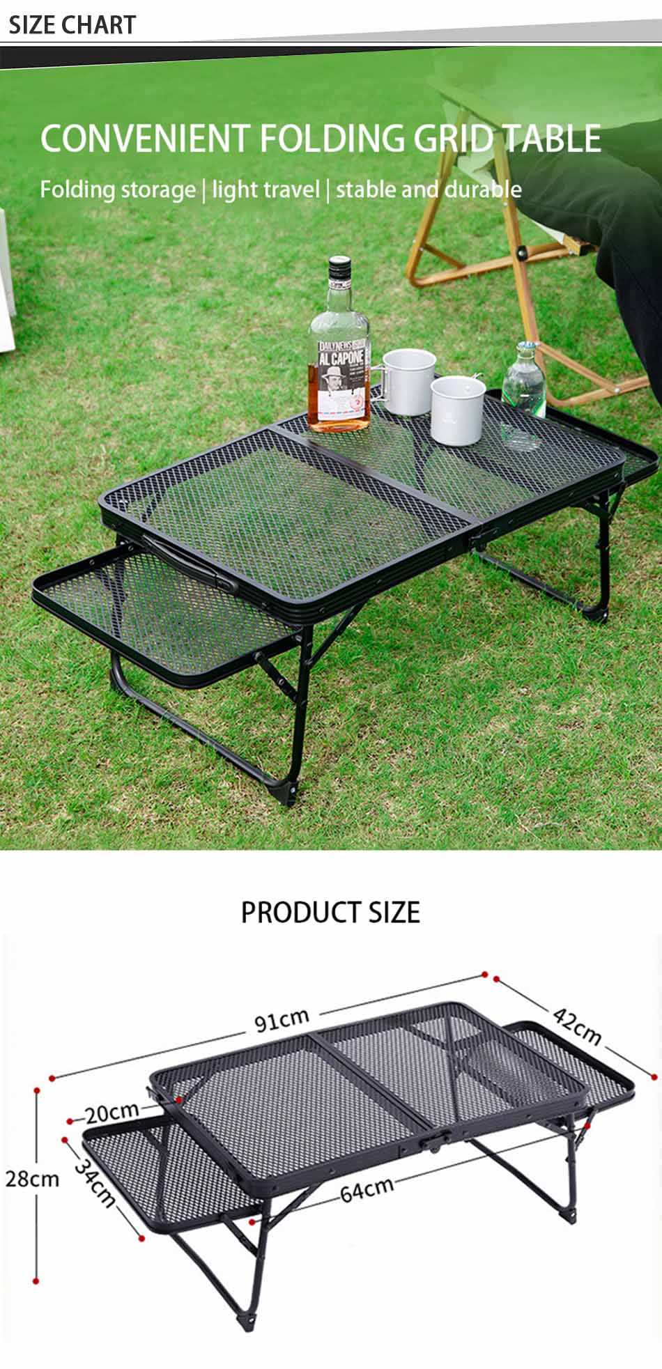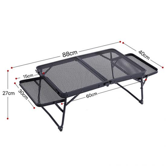 Producto : La moderna mesa plegable de malla metálica para exteriores para acampar presenta un marco de hierro liviano, una superficie de malla duradera, fácil portabilidad y estabilidad, perfecta para barbacoas, picnics y aventuras al aire libre.