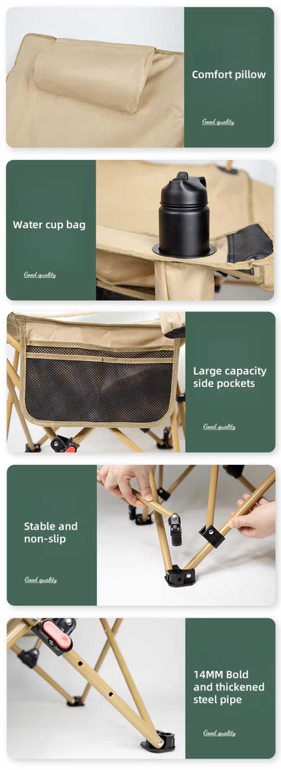 Marca : Anhui Feistel Factory Relacionar la fabricación : OEM y ODM Producto : Esta silla de campamento portátil presenta un diseño liviano y plegable con una construcción duradera y bolsillos laterales convenientes, perfecto para viajes de playa, acampar y relajación al aire libre.