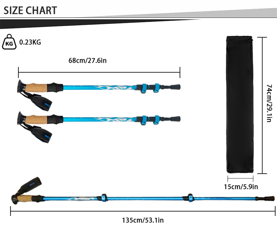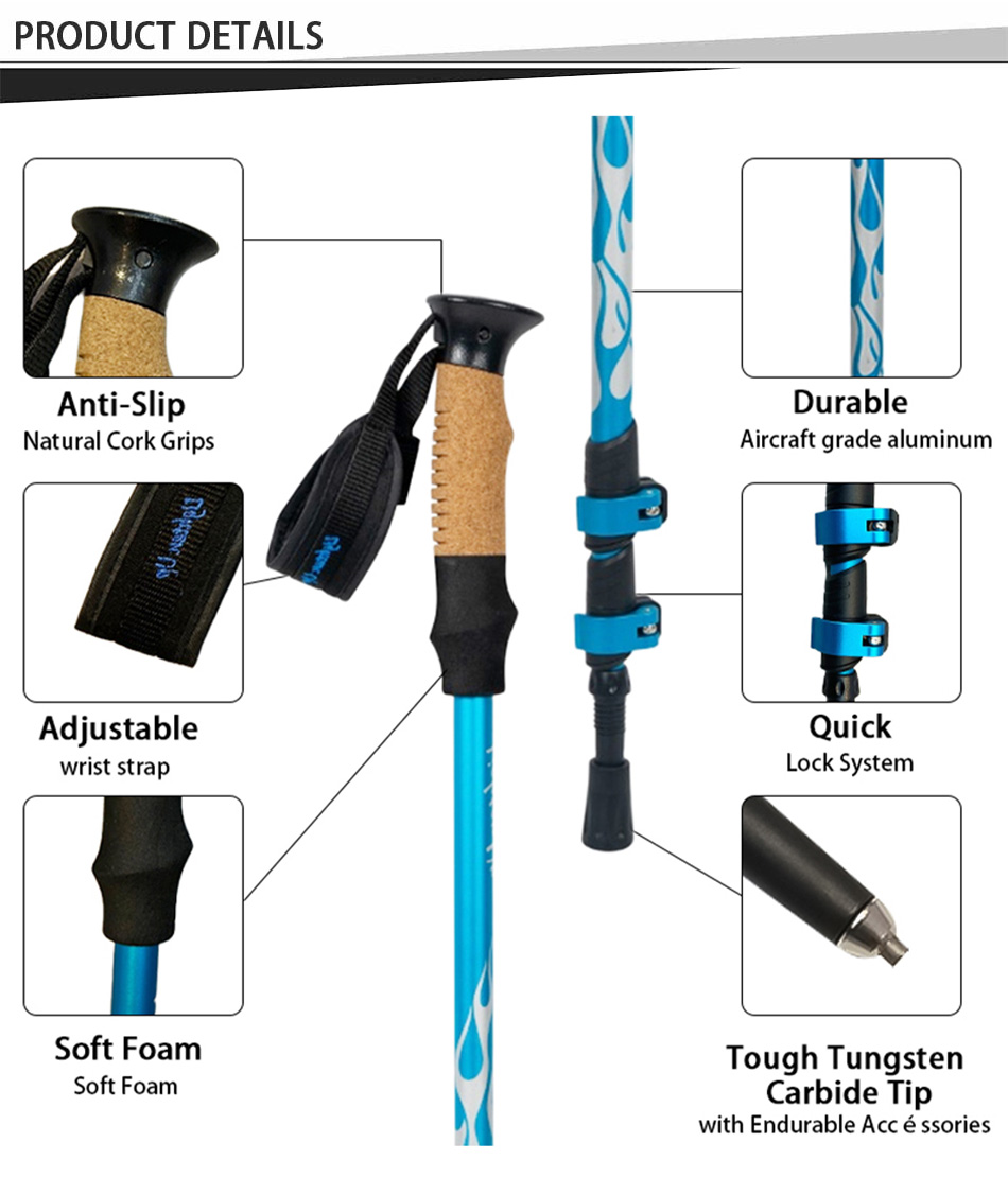 Producto : Los bastones de senderismo para exteriores livianos y personalizados de fábrica con empuñaduras de corcho natural y extensiones de EVA brindan comodidad, estabilidad y durabilidad, ofreciendo un soporte confiable para trekking, escalada y caminatas de larga distancia.