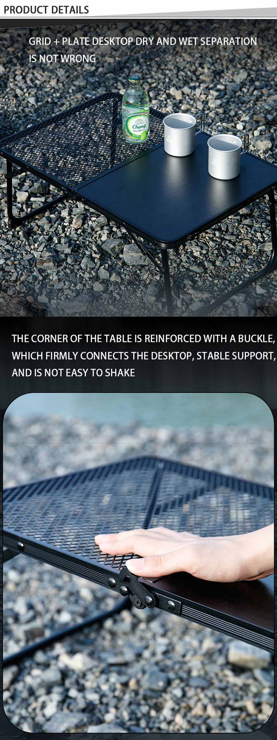 1. Diseño de mesa plegable para acampar : el diseño plegable de la mesa es cómodo de transportar y ahorra espacio. 2. Fácil de montar, no se necesitan otras herramientas y la mesa se puede montar en tan solo unos segundos, lo que ahorra tiempo y esfuerzo. 3. Súper duradero y estable: hecho de aleación de aluminio de alta calidad, resistente y duradero, impermeable y fácil de limpiar. 4. Servicio personalizado: Hay diferentes tamaños y colores para elegir, y también puedes personalizar el logotipo. 5. Multiusos: especialmente adecuado para actividades al aire libre, utilizado como mesa para acampar al aire libre, senderismo, picnic, barbacoa, mesa de picnic, pesca, playa y uso en interiores.