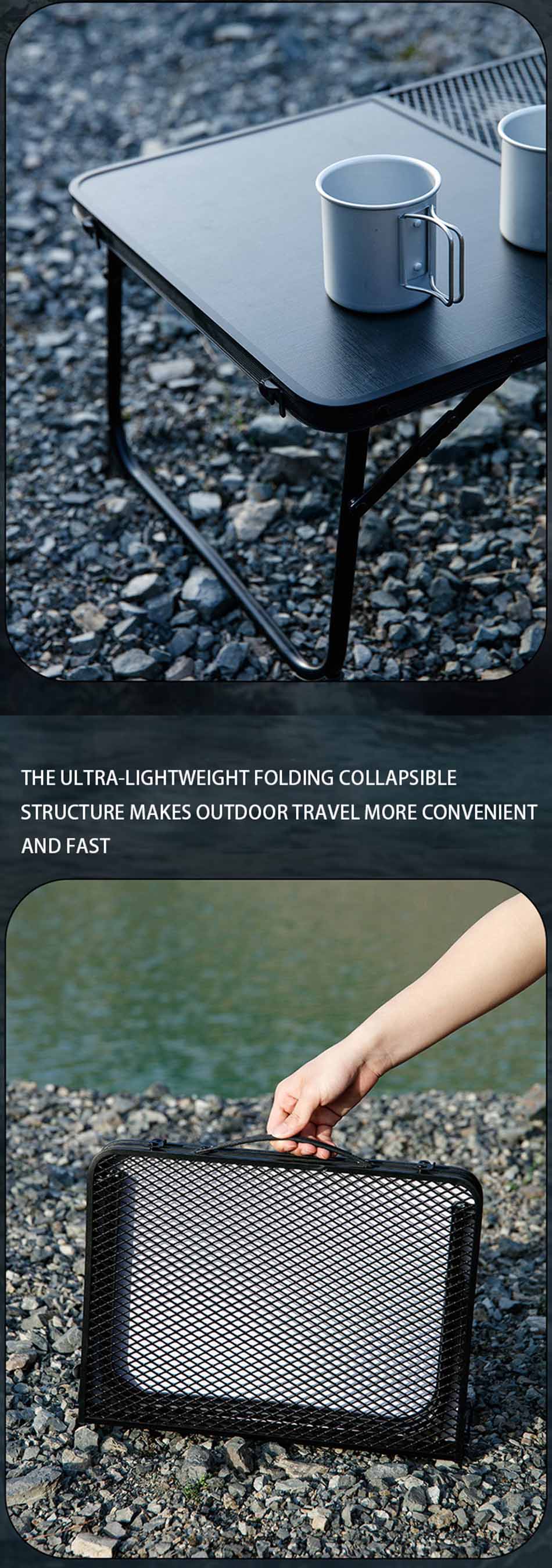 Producto : La mesa de camping de malla portátil ultraliviana para jardín al aire libre cuenta con un marco de aluminio duradero, un diseño plegable IGT compacto y una superficie de malla transpirable ideal para un uso versátil en exteriores.