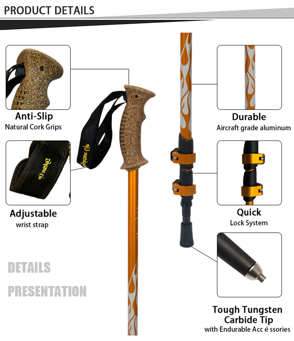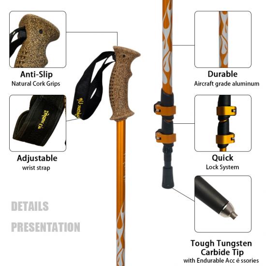 Producto : Los bastones de trekking portátiles y ajustables de aluminio de grado aeronáutico cuentan con una construcción duradera, mangos de goma cómodos, accesorios de punta intercambiables y soporte confiable para caminatas activas, senderismo, trekking y aventuras al aire libre.