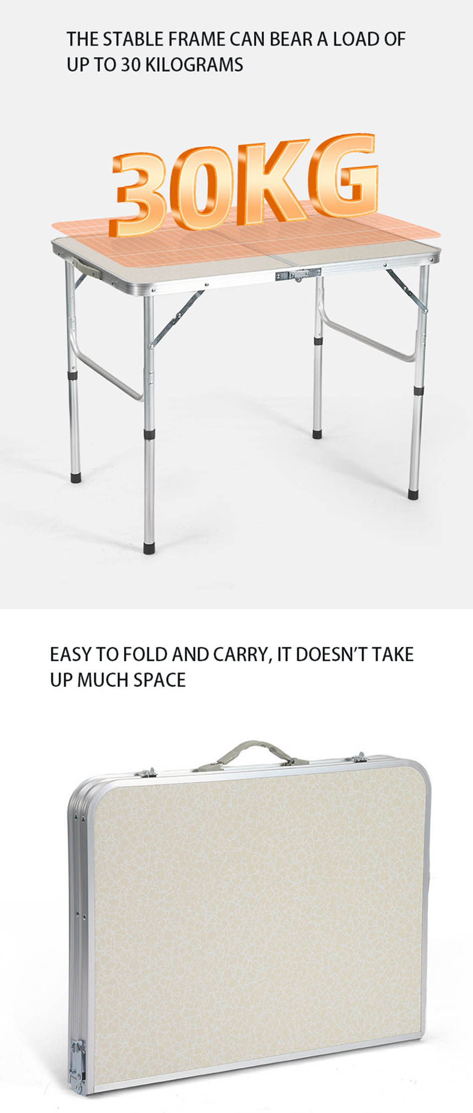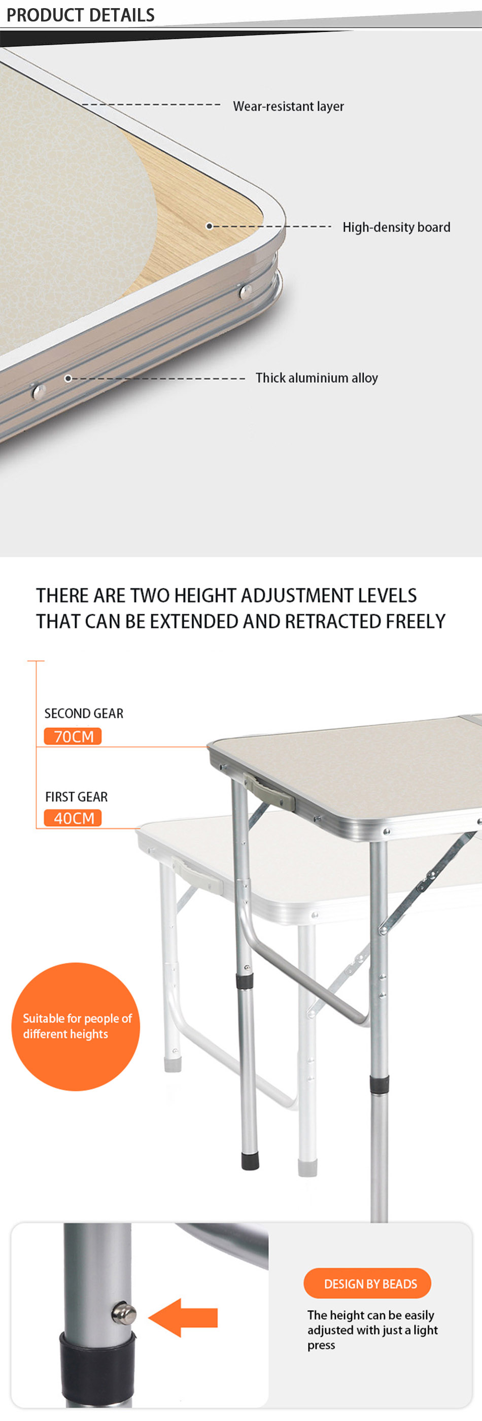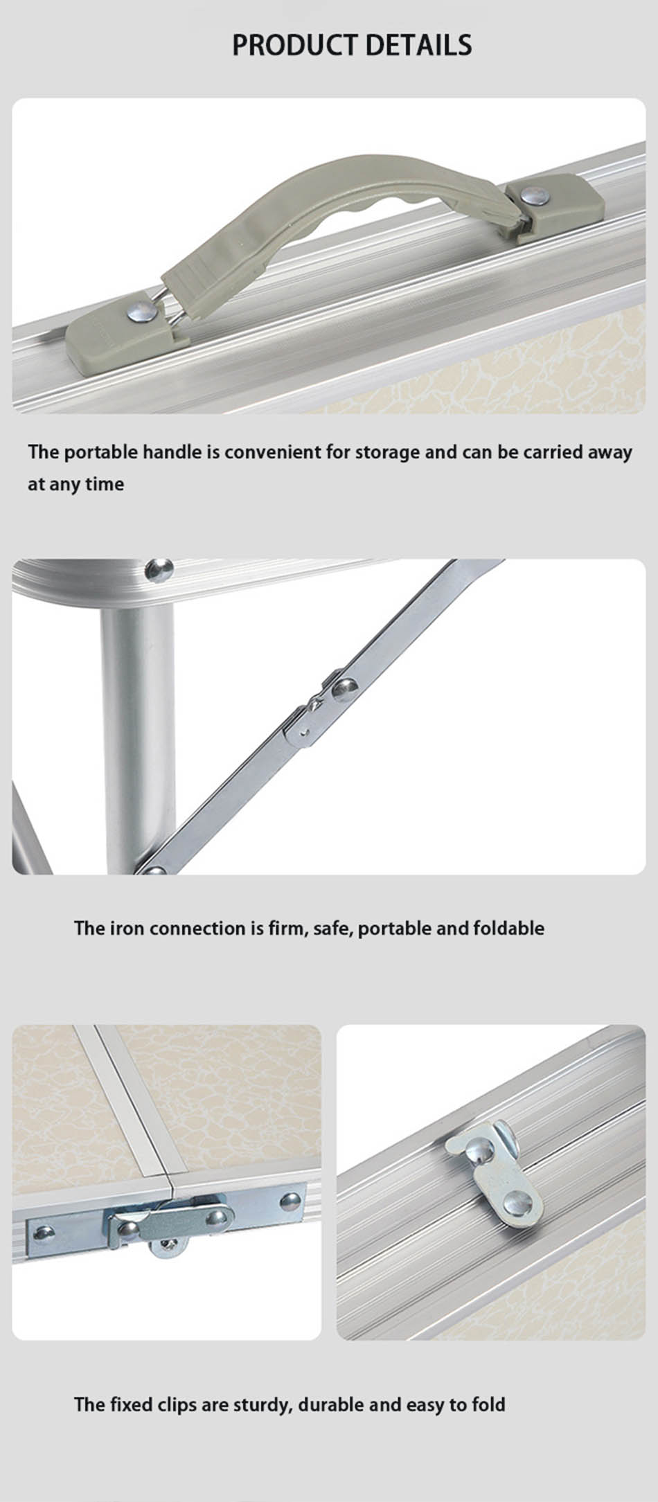 1. Diseño de mesa plegable para acampar : el diseño plegable de la mesa es cómodo de transportar y ahorra espacio. 2. Fácil de montar, no se necesitan otras herramientas y la mesa se puede montar en tan solo unos segundos, lo que ahorra tiempo y esfuerzo. 3. Súper duradero y estable: hecho de aleación de aluminio de alta calidad, resistente y duradero, impermeable y fácil de limpiar. 4. Servicio personalizado: Hay diferentes tamaños y colores para elegir, y también puedes personalizar el logotipo. 5. Multiusos: especialmente adecuado para actividades al aire libre, utilizado como mesa para acampar al aire libre, senderismo, picnic, barbacoa, mesa de picnic, pesca, playa y uso en interiores.