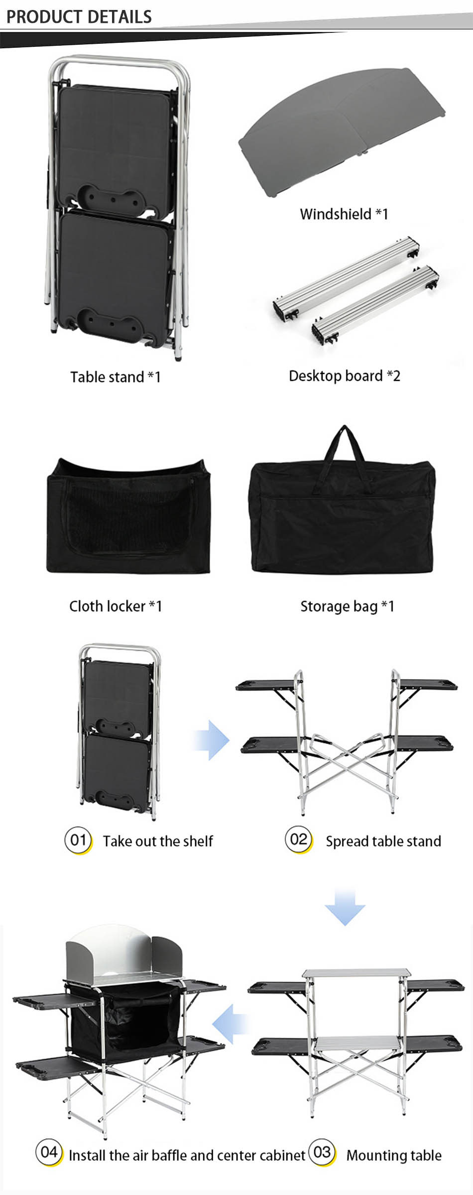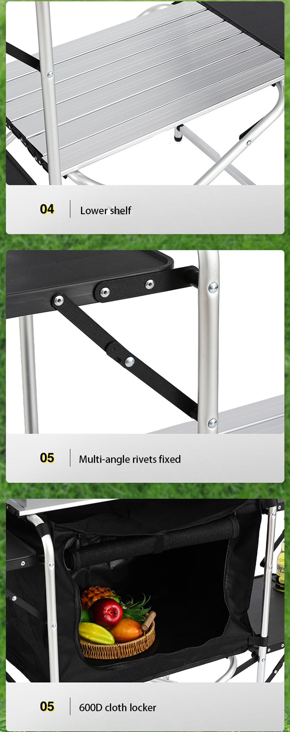 1. Diseño de mesa plegable para acampar : el diseño plegable de la mesa es cómodo de transportar y ahorra espacio. 2. Fácil de montar, no se necesitan otras herramientas y la mesa se puede montar en tan solo unos segundos, lo que ahorra tiempo y esfuerzo. 3. Súper duradero y estable: hecho de aleación de aluminio de alta calidad, resistente y duradero, impermeable y fácil de limpiar. 4. Servicio personalizado: Hay diferentes tamaños y colores para elegir, y también puedes personalizar el logotipo. 5. Multiusos: especialmente adecuado para actividades al aire libre, utilizado como mesa para acampar al aire libre, senderismo, picnic, barbacoa, mesa de picnic, pesca, playa y uso en interiores.