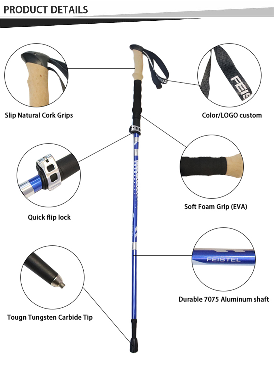 Feistel, venta al por mayor, aleación de aluminio, mango de corcho EVA, bastones de trekking plegables de bloqueo rápido